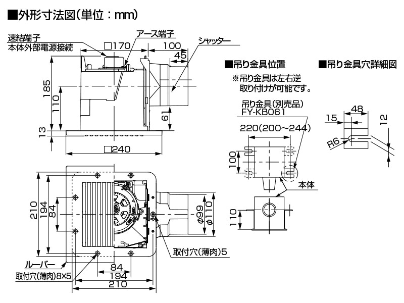 | 品番 | 消費電力(W) | 換気風量(m³/h) | 有効換気量(m³/h) | 騒音(dB) | 質量(kg) | 埋込寸法(mm) | 適用パイプ 呼び径(mm) |