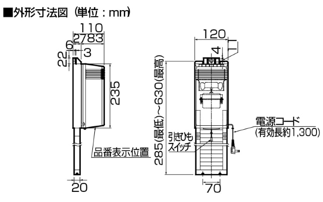 | 品番 | 消費電力(W) | 換気風量(m³/h) | 騒音(dB) | 質量(kg) | 取付け可能窓枠高さ (mm) |