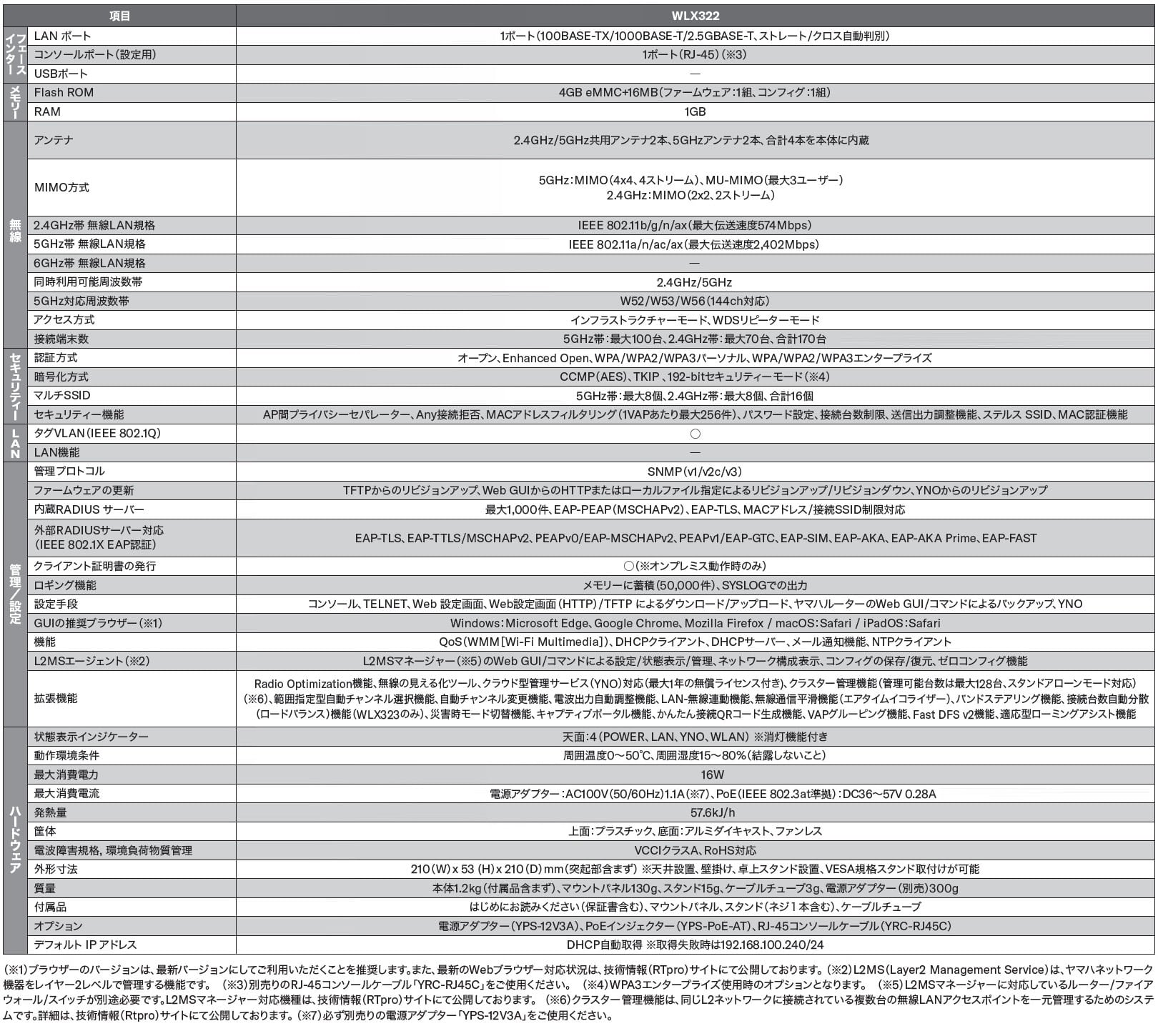 ■特長●無線APの性能を落とさずに、航空・気象レーダーの影響を回避「Fast DFS v2」●多数台の無線端末を収容可能●移動しても快適な通信を実現「適応型ローミングアシスト機能」●天井設置環境に適したアンテナの指向性で、広いエリアで強い電波を提供●管理負荷を軽減するシンプルな無線LAN管理機能の継承■仕様