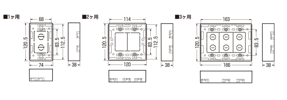 ●1ヶ用は1~3号モールに、2ヶ用・3ヶ用は1~4号モールにそれぞれ適合する兼用ノックアウト付です。