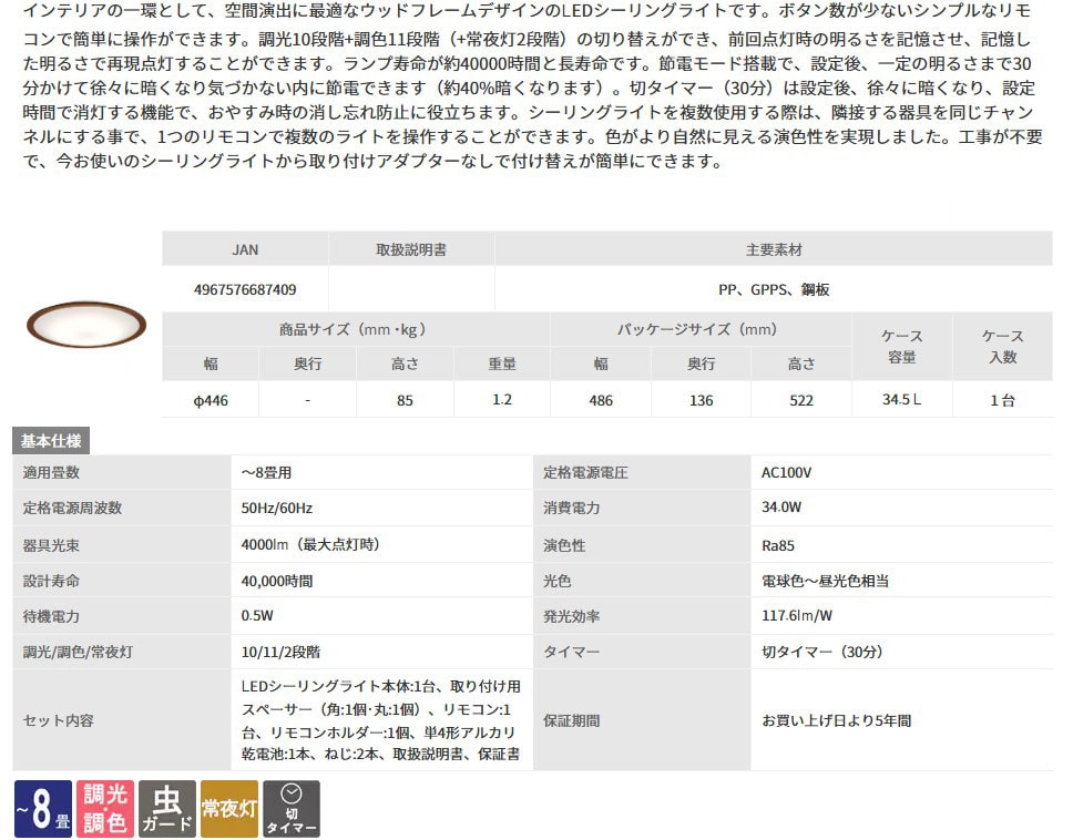 【アイリスオーヤマ】LEDシーリングライト 8畳調光調色 ウッドフレーム CEA8DL-5.0QWFM