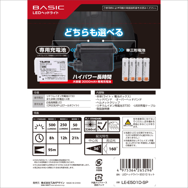 ●明るさ:最大500lm、250lm、50lmの3照射切替