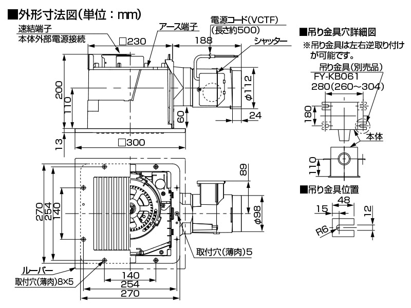 | 品番 | 消費電力(W) | 換気風量(m³/h) | 有効換気量(m³/h) | 騒音(dB) | 質量(kg) | 埋込寸法(mm) | 適用パイプ 呼び径(mm) |