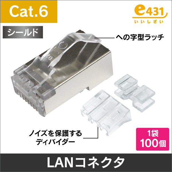 RJ-45 シールド付 コネクタ(モジュラープラグ) LAN Cat.6用本体が金属でシールドされており、ケーブルやコネクターへのノイズを防止。への字型ラッチにより、ラッチの破損を防ぎます。対応ケーブル:単線/より線 共用 AWG24-26適用絶縁体径:1.0mm~1.1mm適用ケーブル外径:5.5mm~7mm付属品:ディバイダー、ロードバー1袋=100個入