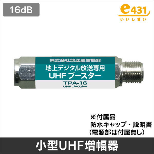 e431オリジナル UHFブースター e431の長年にわたる放送関連機器の販売/開発実績と、ブースター販売実績から得たノウハウをこの商品の開発に注ぎ込みました。 お客様のニーズやお困りごとを直接伺ってきたe431だからできた、プロ向け特化型のブースターです。 ・高利得 45dB 業界トップクラス ブースター利得45dBと業界トップクラス。 余裕ある利得で設置場所・地域を選ばずご利用いただけます。 45dB/35dB/30dB対応 ・高シールド・低雑音 UHF1.5dB以下 シールドケースにはダイキャスト一体型の構造を採用。シールド性能を強化。 外来電波の影響・電波の漏洩を防ぎます。 経年劣化にも強いため、長く安心してお使い頂けます。 ・電源部プラグ トラッキング防止加工 ・電源部は、15V600mAで余裕ある設計 ・各メーカーのアンテナで動作確認済 ■附属品 F型接栓(5Cケーブル用) 4個 防水キャップ(大) 2個 取扱説明書 1部4,100円(税込)~