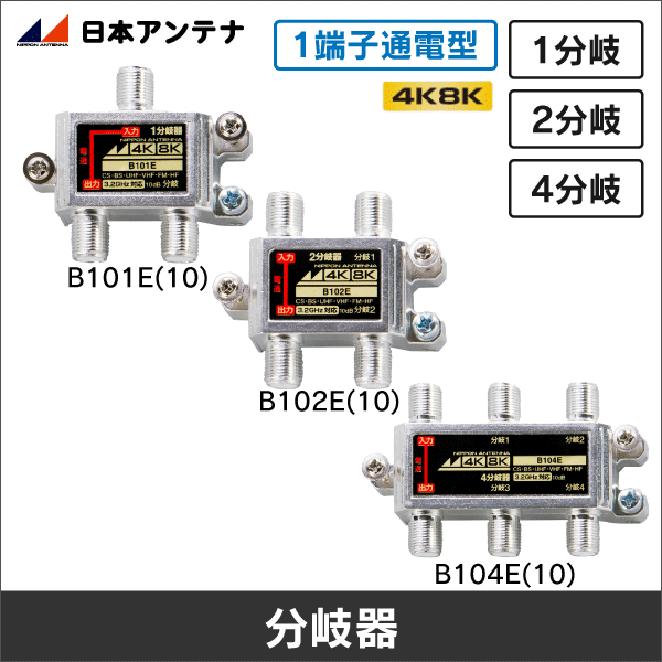 DXアンテナ BL認定分岐器【4K8K対応】 新4K8K衛星放送(3224MHz)対応の幹線から信号を取り出す屋内用1・2・4分岐器です。 ノイズに強いダイカスト構造です。 BL優良住宅部品認定品です。 仕様・規格 ・BL優良住宅部品認定品 ・周波数帯域: 10~3224MHz 【2K4K8K放送対応】 ・入出力端子: F型端子 ・挿入損失: 1.5dB(770MHz)、4.5dB(3224MHz) ・結合損失: 12dB(770MHz)、15.5dB(3224MHz) ・通電機能:なし ・構造: 亜鉛ダイカスト ・外形寸法: 49×49×16.5mm、49×71×16.5mm(本体部) ・質量: 39g、41g、61g ・付属品: なし