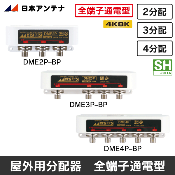 DXアンテナ 屋外用分配器 全端子通電型【4K8K対応】 新4K8K衛星放送(3224MHz)対応の屋外用2・3・4分配器です。 屋外使用可能な防雨構造で樹脂ケース内部はノイズに強いダイカスト構造です。 ケーブル入線加工が不要な防水キャップや蝶ナット1本でマスト取付できる簡単金具を採用した省施工設計です。 全端子通電仕様です。 仕様・規格 ・周波数帯域: 10~3224MHz ・入力出力端子: F型端子 ・通電機能: 全出力端子→入力端子間 ・通電容量: DC15V 0.8A 以下 ・構造: ダイカスト製シールドケース、防雨型樹脂カバー ・適合マスト径: φ22~49mm ・付属品:F5接栓、防水キャップ、マスト取付金具 2分配器:F5接栓、防水キャップ各3個、マスト取付金具×1 3分配器:F5接栓、防水キャップ各4個、マスト取付金具×1 4分配器:F5接栓、防水キャップ各5個、マスト取付金具×1 ・JEITA SHマーク認証済