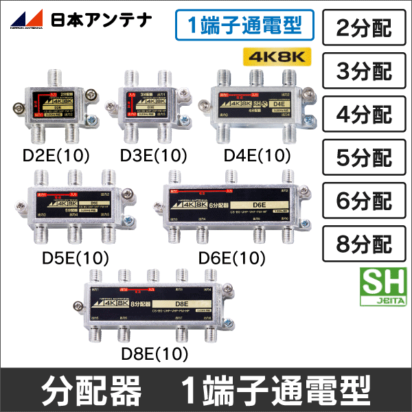 DXアンテナ 屋外用分配器 1端子通電型【4K8K対応】 新4K8K衛星放送(3224MHz)対応の屋外用2・3・4分配器です。 屋外使用可能な防雨構造で樹脂ケース内部はノイズに強いダイカスト構造です。 ケーブル入線加工が不要な防水キャップや蝶ナット1本でマスト取付できる簡単金具を採用した省施工設計です。 一つの出力端子のみ電流が通過する1端子通電仕様です。 仕様・規格 ・周波数帯域: 10~3224MHz ・入力出力端子: F型端子 ・通電機能:出力1端子・入力端子間 ・通電容量: DC15V 0.8A 以下 ・構造: ダイカスト製シールドケース、防雨型樹脂カバー ・適合マスト径: φ22~49mm ・付属品:F5接栓、防水キャップ、マスト取付金具 2分配器:F5接栓、防水キャップ各3個、マスト取付金具×1 3分配器:F5接栓、防水キャップ各4個、マスト取付金具×1 4分配器:F5接栓、防水キャップ各5個、マスト取付金具×1 ・JEITA SHマーク認証済