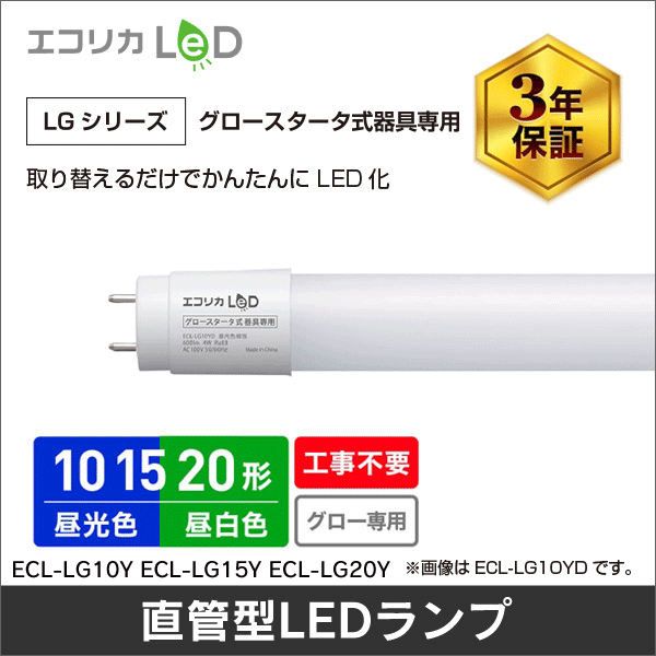 ●消費電力が少なく、家計に優しい ●取り替えるだけでかんたんにLED化 ●電気代を大幅削減しかも長寿命 ●工事不要 いつものように取り替えるだけ、電気工事の必要はありません。 既存器具を無駄にしません。 ※製品に付属の専用スタータの設置が必要です。 ※工事不要で交換可能な種類は「FL」から始まる記号の蛍光灯でグロースタータが付いている照明器具で安定器が劣化していない場合に限ります。 ●長寿命 蛍光灯と比べて約4倍長持ち、エコリカ直管形LEDランプは設計寿命5万時間です。 ※従来の蛍光灯12000時間との比較 ●3年保証 安心・安全にご使用いただくため3年の長期保証を設けております。 ■仕様 ・使用温度:-20~+40℃ ・入力電圧:AC100V(50/60Hz) ・定格寿命:50000時間 ※定格寿命は平均値であり保証値ではありません。 ・配光角:約240°(ピーク照度50%のとき150°) ・ノイズ対策:CISPR 15/VCCI Class B ※ランプ単体の評価です。 ・材質:ガラス+飛散防止フィルム加工 ・保証期間:3年